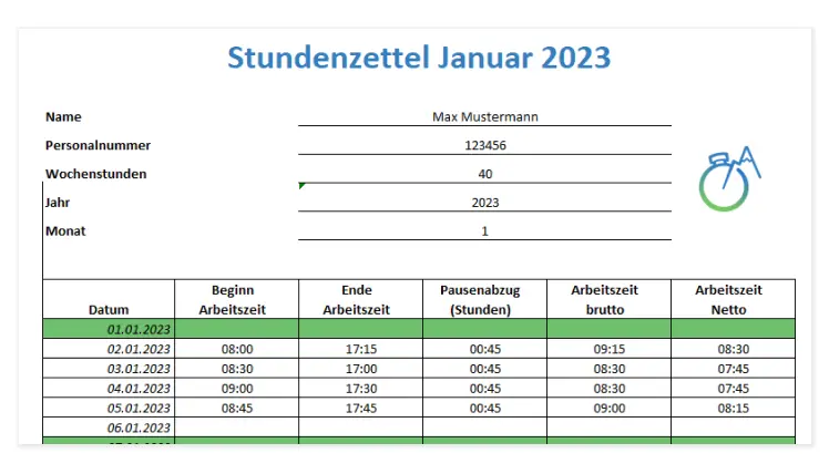Excel-Arbeitszeiterfassung Vorlage mit Überstundenfunktion, kompatibel ab Excel 2007. Ideal zur einfachen und genauen Zeiterfassung für PC und Mac, ermöglicht effiziente Arbeitszeiterfassung.