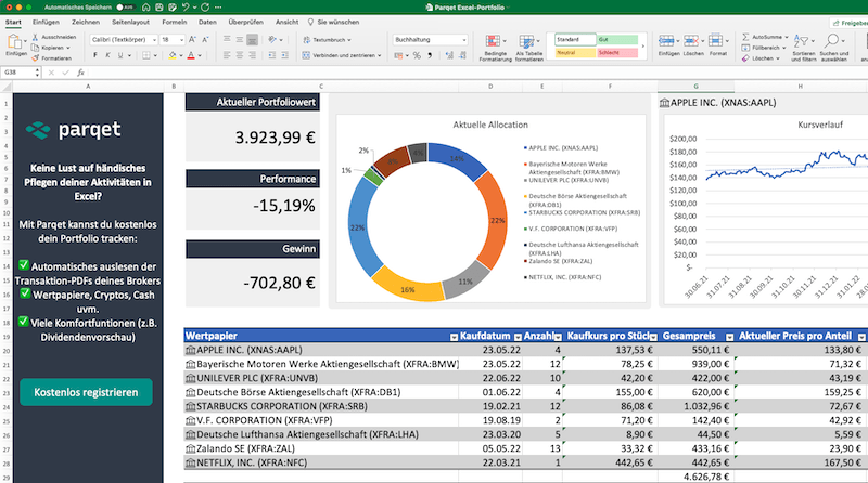 Kostenlose Excel-Vorlagen für Aktienanalyse mit 30 Tagen Testversion. Realtime-Datenanschluss an Interactive Brokers und deutsche Börsen für präzise und aktuelle Finanzübersichten.