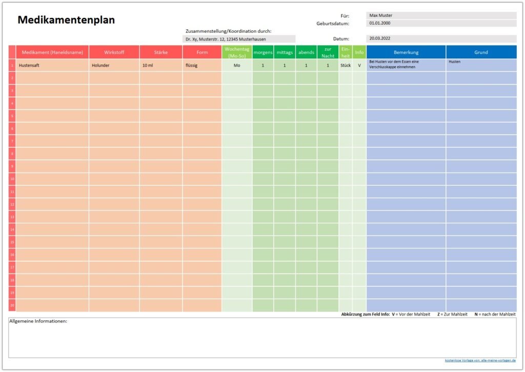Praktische Excel-Vorlage für Ihren Medikationsplan mit Angaben zu Medikamentenname, Dosis und Einnahmezeiten vor, während und nach den Mahlzeiten. Einfach und übersichtlich gestalten.