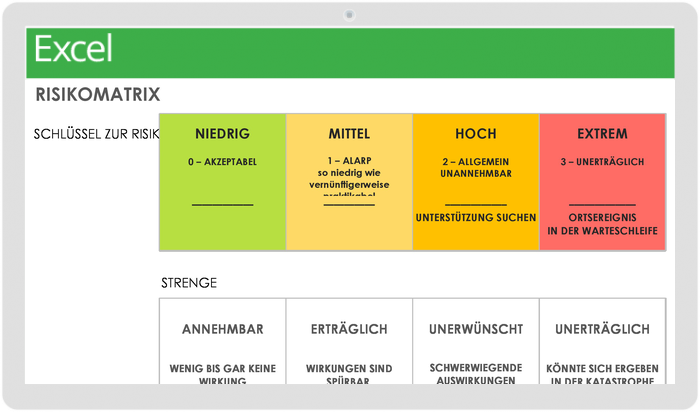 Diese Vorlage ist eine äußerst nützliche Risikomatrix Vorlage Excel, die Ihnen hilft, potenzielle Risiken in Projekten oder Geschäftsprozessen effektiv zu identifizieren, zu bewerten und zu verwalten. Die Verwendung dieser Vorlage ermöglicht es Ihnen, eine klare Übersicht über die Risiken zu erhalten, die sich auf den Erfolg Ihrer Aktivitäten auswirken könnten. Dadurch können Sie fundierte Entscheidungen treffen, um entsprechende Maßnahmen zu ergreifen und die Risiken zu minimieren. Die Risikomatrix ist nicht nur in Excel verfügbar, sondern auch als Risikomatrix Vorlage PowerPoint, was eine einfache Präsentation der Ergebnisse ermöglicht.